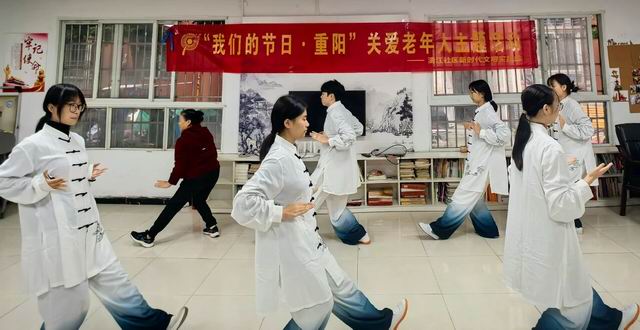 学生志愿者带领老人们练习传统养生功法太极拳,在一招一式的舒缓动作中传递“未病先防”的健康理念,营造出敬老爱老、崇尚健康的良好氛围。