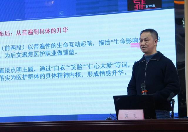 讲座中,吴飞老师以其深厚的音乐素养与丰富的创作经验,从中国传统音乐的韵律之美、旋律里的文化基因,到当代音乐创作中的家国情怀,层层递进、娓娓道来。他结合个人作品的深度赏析与创作背后的感人故事,生动诠释了音乐如何承载民族记忆、传递文化自信,让在场师生沉浸式感受“以乐载道、以美育人”的独特力量。