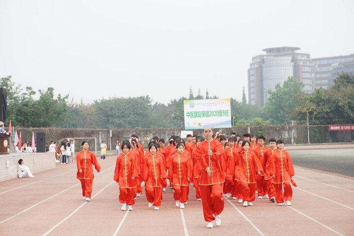 活动由班级入场式和传统保健运动项目比赛两部分组成。班级入场式中,师生集思广益、亮点频出,在庆祝中国共产党建党100周年之际,抒发了“针灸人”爱党、爱国、爱校、爱家的家国情怀,展现了针灸学子朝气蓬勃、青春洋溢、健康向上、团结友爱的班级风采。比赛分太极拳、八段锦、易筋经三个项目进行,共计评选出一等奖9个,二等奖9个,三等奖8个。护理2020级7班、中医康复保健2020级5班、中药高职2020级、中医康复保健2020级1班荣获太极拳组一等奖;药剂2019级3班、康复治疗技术2019级1班、中医康复保健2019级2班、康复治疗技术2019级2班荣获八段锦组一等奖;护理高职2018级荣获易筋经组一等奖。