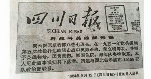 1984年9月的一天,四川省岳池县的一个小伙,拉完煤后开着拖拉机到山下的加油站加油。这个小伙名叫柴兵荣。在等待加油的间隙,他走到了加油站报纸架旁,随手拿起一份9月12日的《四川日报》翻看起来。当他翻到报纸第四版的时候,上面一则寻人启事一下子吸引了他的注意。
