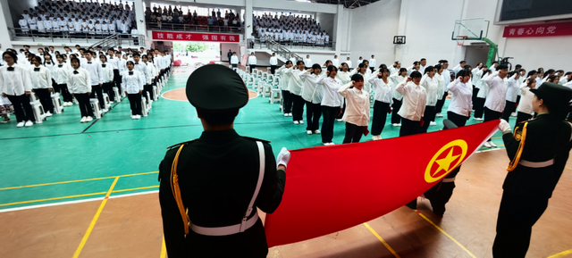 在庄严的团旗下,学校优秀团员代表为新团员佩戴团徽、颁发团章。校团委先海睿同学带领新团员进行宣誓,团员们铿锵有力的誓言响彻全场。
